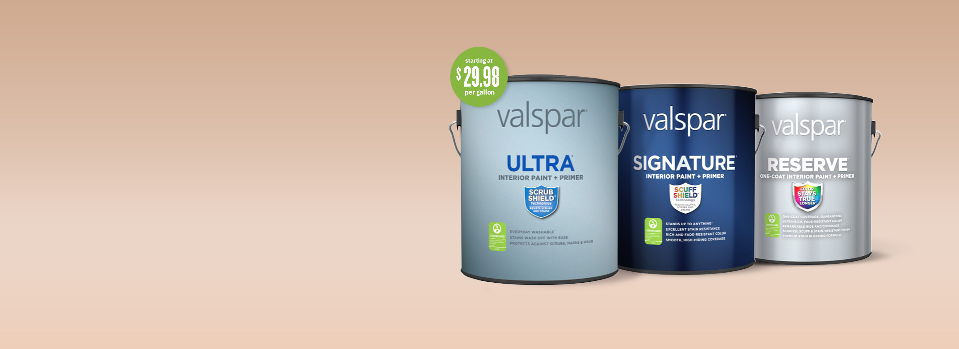 Reserve, Ultra and Signature interior paints on a pink background. Ultra has a “starting at 29.98 per gallon” burst on it.