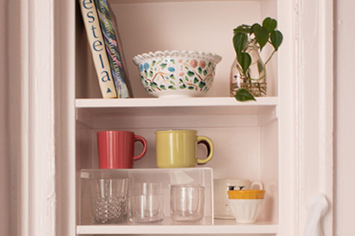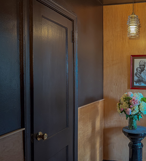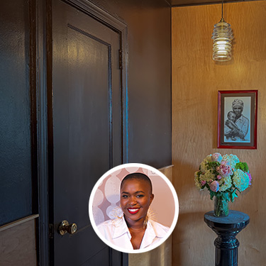Once the paint was dry, I added the storage shelves and wall paneling, which were sanded and stained to match the color of the flooring. Fresh flowers, candles, precious artwork, and catchall trays help bring the space together so my best friend, Derel, can enjoy his newly improved entryway.