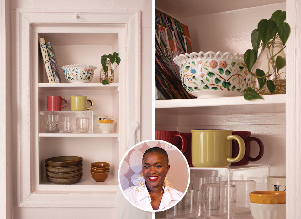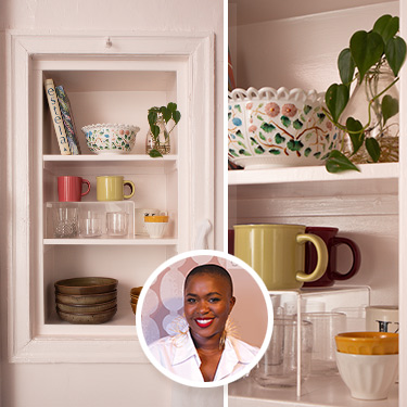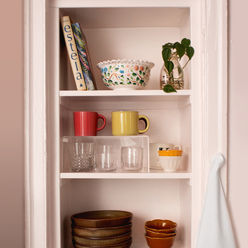 I styled these shelves with my everyday dishes and added little knickknacks and books to give them that personal touch. Acrylic risers and beautiful dishware are all you need to style a shelf like this, but there are no limits to what you can do in your space.