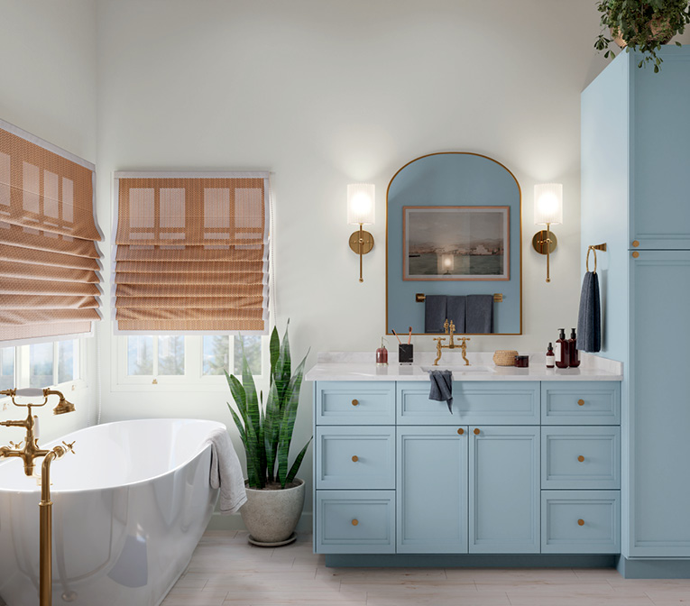 Natural light changes the appearance of colors throughout the day, from sunrise to midday to sunset. A space full of natural light brings out subtle undertones in lighter, cooler colors. If your bathroom doesn’t have much natural light, it’s a good idea to lean into interior lighting. Warm light temperatures are a popular choice, and they can help vivid and bold colors feel more livable.