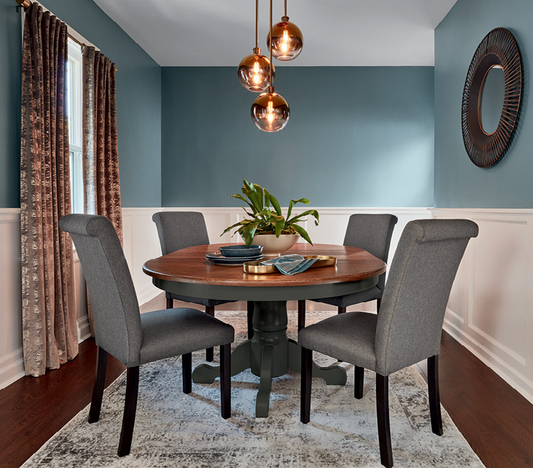The table is the focal point of the dining room, so it makes sense to design around it. Try colors that complement the tones of the table, as well as the rest of your dining furniture and décor.