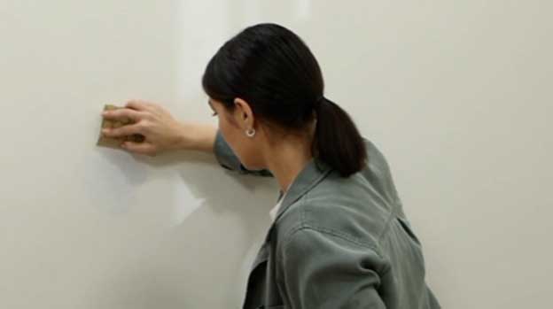 Primero, deberá preparar la pared. Comience lijando ligeramente el área dañada con papel de lija para refinar los bordes y eliminar fragmentos de la superficie. Limpie el polvo.